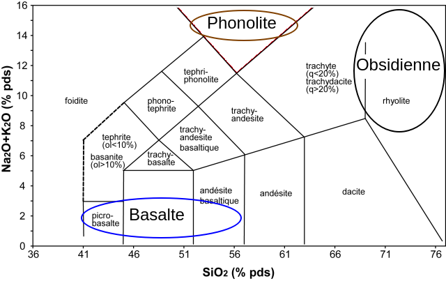 Un magma de composition basaltique conduit à une lave phonolithique par appauvrissement relatif en minéraux ferro-magnésiens qui cristallisent en profondeur (minéraux incompatibles avec les nouvelles conditions). Le résidu magmatique est donc enrichi en silice et Na-K. La phonolite correspond à du feldspath fondu.