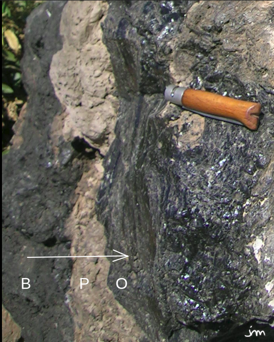 Différentes coulées dans un même bloc,B: basalte, P: phonolite, O: obsidienne,