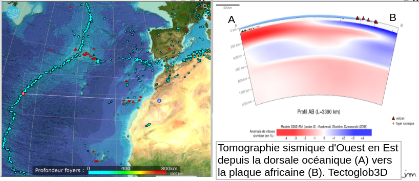 La tomographie sismique montre une anomalie de vitesse (-1%) sous les Canaries. La vitesse des ondes sismiques y est plus faible ce qui correspond à une zone plus chaude.